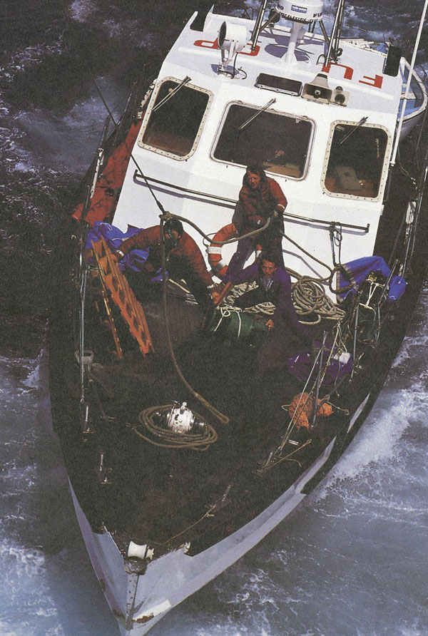 Tout se passe alors très vite, dans l’intervalle de quelques minutes séparant les cycles de déferlantes. Debout à l’avant de la vedette, solidement campés sur leurs jambes pour parer le roulis, les marins saisissent le « ballon » suspendu à un filin qui se balance depuis la potence du phare. On passe d’abord les vivres, puis le gardien montant, à moins qu’entre-temps la vedette ait dû battre arrière pour éviter une nouvelle série de déferlantes.