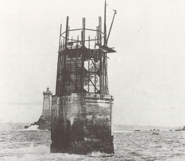 Le chantier s’ouvre dès l’année suivante. Exécutée en maçonnerie de moellons, la construction est ancrée sur des barres de fer scellées dans le rocher. Au terme de trois saisons difficiles la tourelle s’élève à 2,75 m au-dessus de la roche; son diamètre est de 4,50 m à la base avec un fruit latéral de un dixième. Après une interruption de cinq ans due à l’indisponibilité du vapeur retenu ailleurs, les travaux reprennent. Il faut en effet, comme le préconise M. Considère, ingénieur à Quimper, « exhausser l’ouvrage au moins jusqu’à huit mètres au-dessus du niveau des hautes mers, de manière à être en situation de recevoir un feu permanent!’ Cet ajout aura la forme d’un tronc de pyramide octogonal de 4,20 m de diamètre coiffant la tourelle existante.