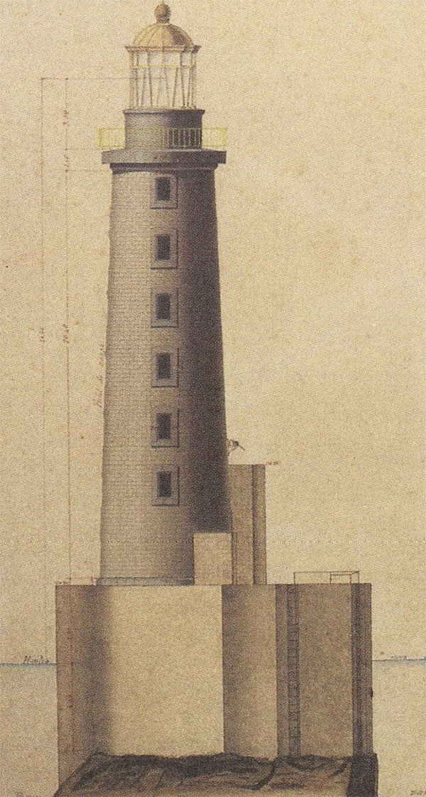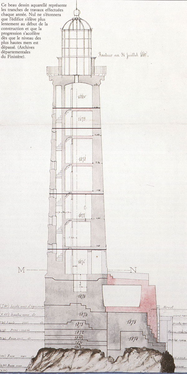 « Jusqu’au niveau des plus hautes mers, le phare aura un diamètre de 7,20 m obligé par la surface du rocher, puis 6,80 m pour les deux mètres suivants. Son diamètre intérieur passera de 3 m dans le bas, à 3,30 m dans le haut, par le jeu d’une diminution d’épaisseur des murs : de 1,75 m en bas, il sera à 0,80 m au-dessous de la corniche de couronnement.